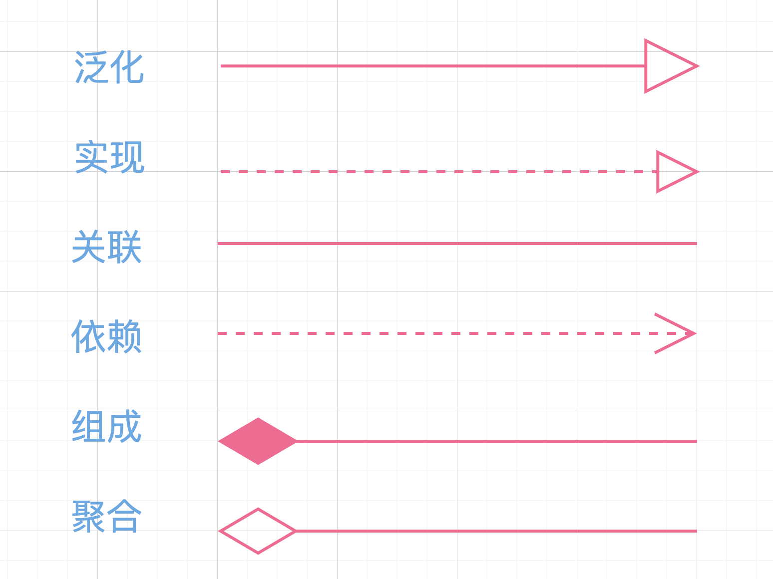 类之间有6种主要的关系类型:泛化(继承)、实现、组合、聚合、关联和依赖。六种关系的类图中箭头如下:
